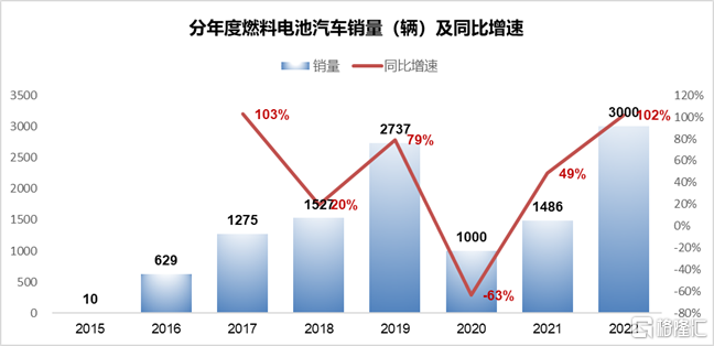 隨后市場就給了這些蜂擁而至的先驅們當頭一棒,大家立馬“人間清醒”。疫情帶來的對客車以及各類公共用途專用車的需求下降,氫燃料汽車需求直接腰斬,2020年只有1000輛,直到2022年銷量才恢復到3000輛的規(guī)模。
