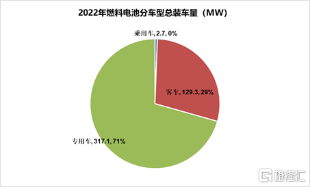 此外,燃料電池裝機的主力已經(jīng)從客車轉向以重卡為代表的專用車。氫能起初主要用在城市公交上,就像純電車最早也是先從城市客車上普及開來一樣。從2022年的裝車量數(shù)據(jù)來看,以重卡為代表的專用車已經(jīng)成為主要的裝機車型,這代表著氫燃料汽車已經(jīng)從純政府補貼開始向實用方向轉換。