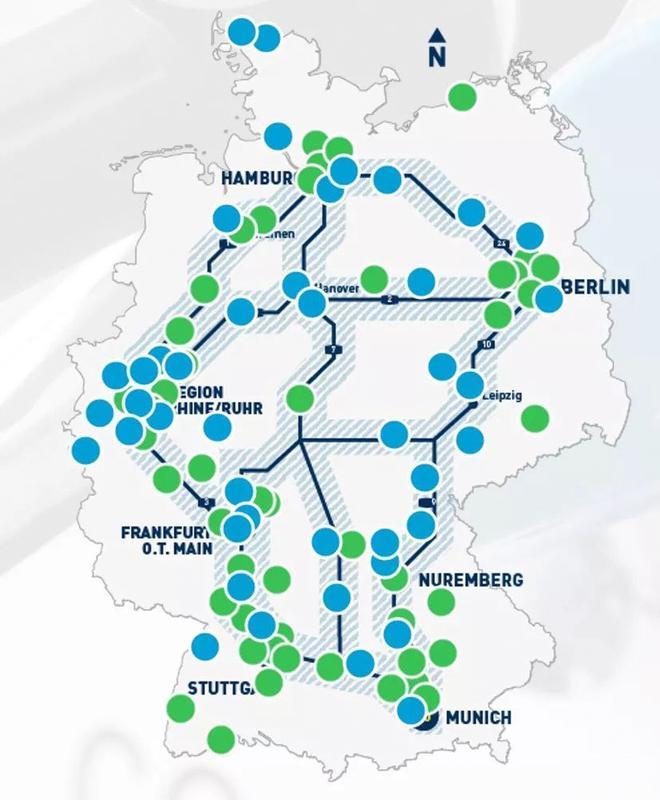 H2M在德國(guó)已經(jīng)運(yùn)營(yíng)(綠色)及在建加氫站(藍(lán)色)示意圖