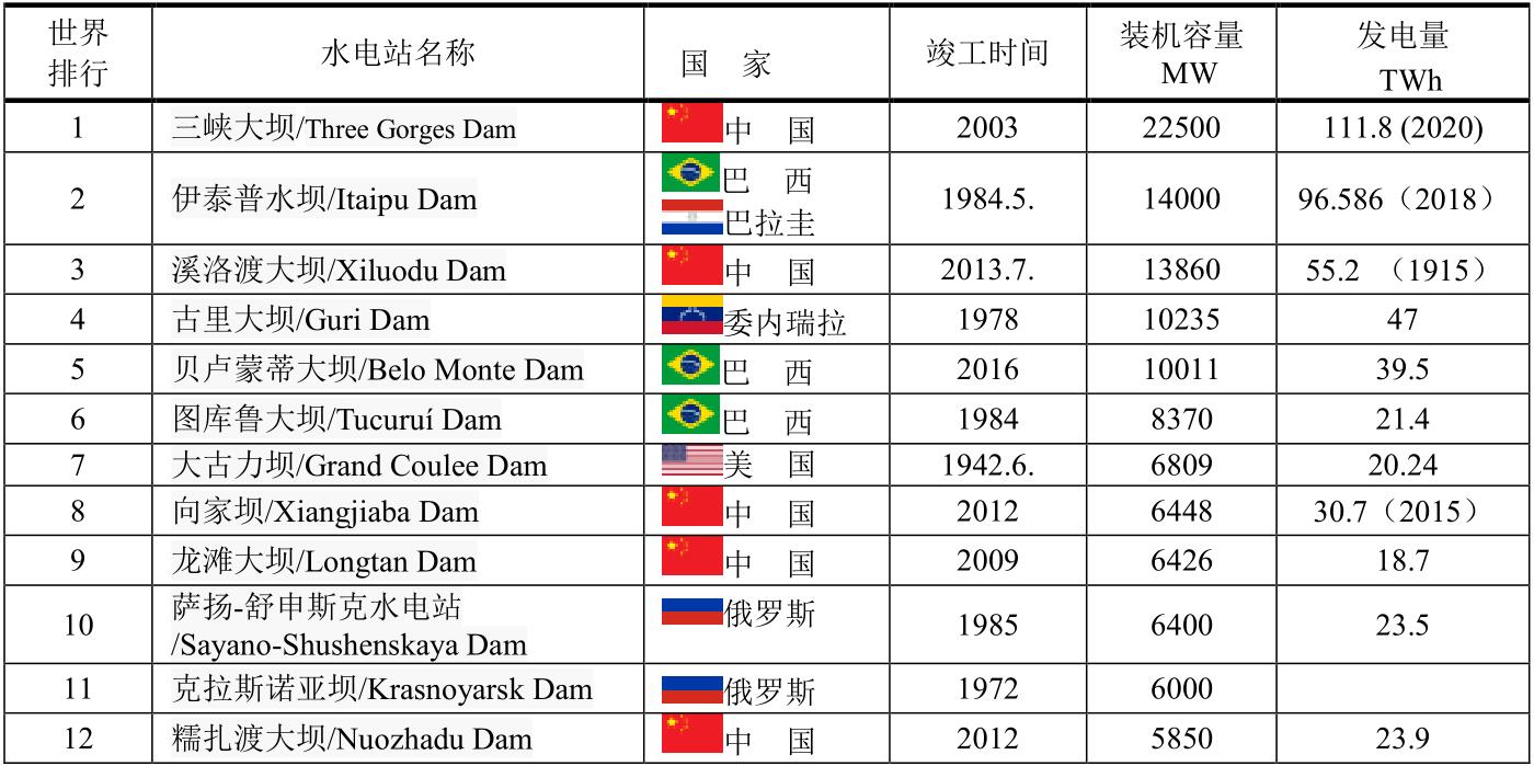 中國(guó)湖北省的三峽水電站仍然是世界上最大的水電站,總裝機(jī)容量為22.50 GW;位于巴西和巴拉圭的伊泰普水電站是世界第二大水電站,裝機(jī)容量為14.00 GW。不過(guò),伊泰普水電站所處的巴拉那河水量豐沛且季節(jié)分布相對(duì)均衡,幾乎可以全年滿負(fù)荷發(fā)電;而三峽水電站則每年都會(huì)經(jīng)歷約6個(gè)月的枯水期,從而限制了其發(fā)電量。