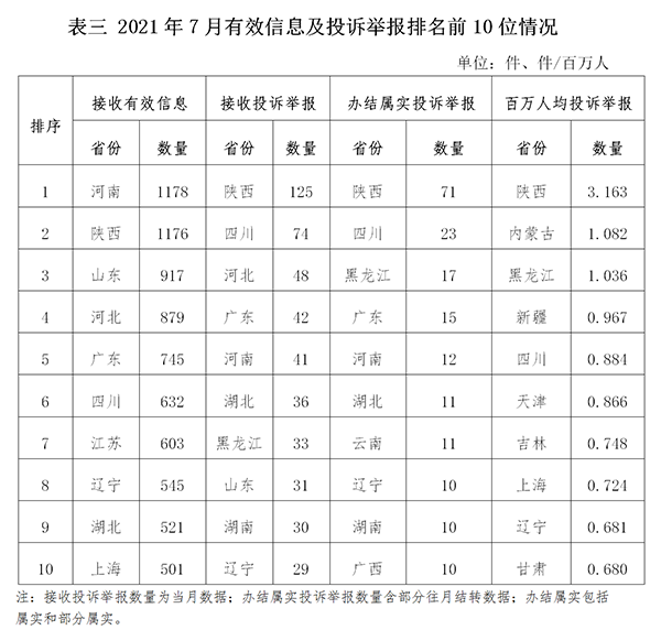各省(自治區(qū)、直轄市)按照接收的有效信息數(shù)量排序,河南、陜西、山東、河北、廣東、四川、江蘇、遼寧、湖北、上海列全國(guó)前10位;按照接收的投訴舉報(bào)數(shù)量排序,陜西、四川、河北、廣東、河南、湖北、黑龍江、山東、湖南、遼寧排在全國(guó)前10位;按照辦結(jié)屬實(shí)的投訴舉報(bào)數(shù)量排序,陜西、四川、黑龍江、廣東、河南、湖北、云南、遼寧、湖南、廣西排在全國(guó)前10位;按照百萬(wàn)人均投訴舉報(bào)數(shù)量排序,陜西、內(nèi)蒙古、黑龍江、新疆、四川、天津、吉林、上海、遼寧、甘肅排在全國(guó)前10位。(2021年7月有效信息及投訴舉報(bào)排名前10位情況見(jiàn)表三)