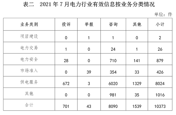 電力行業(yè)排在首位,有效信息數(shù)量為10373件,占全部有效信息的80.90%。群眾關(guān)注的內(nèi)容主要集中在故障停電、供電安全、電表計(jì)量咨詢等方面。(2021年7月電力行業(yè)有效信息按業(yè)務(wù)分類(lèi)情況見(jiàn)表二)