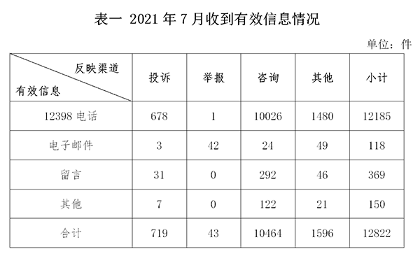 2021年7月,國(guó)家能源局12398能源監(jiān)管熱線(以下簡(jiǎn)稱(chēng)12398熱線)共收到有效信息12822件(包含投訴、舉報(bào)、咨詢和其他訴求類(lèi)別),環(huán)比增加29.52%,同比增加11.58%。(2021年7月收到有效信息情況見(jiàn)表一)