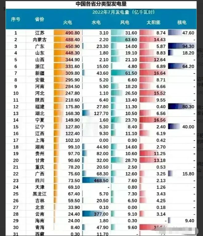 2022年7月全國各省火力發(fā)電量:江蘇省以490.8億千瓦時(shí)位居第一,寧夏接近湖北,四川僅第23。