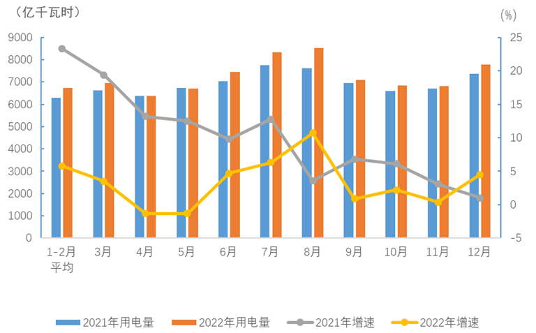 圖1 2021、2022年分月全社會用電量及其增速