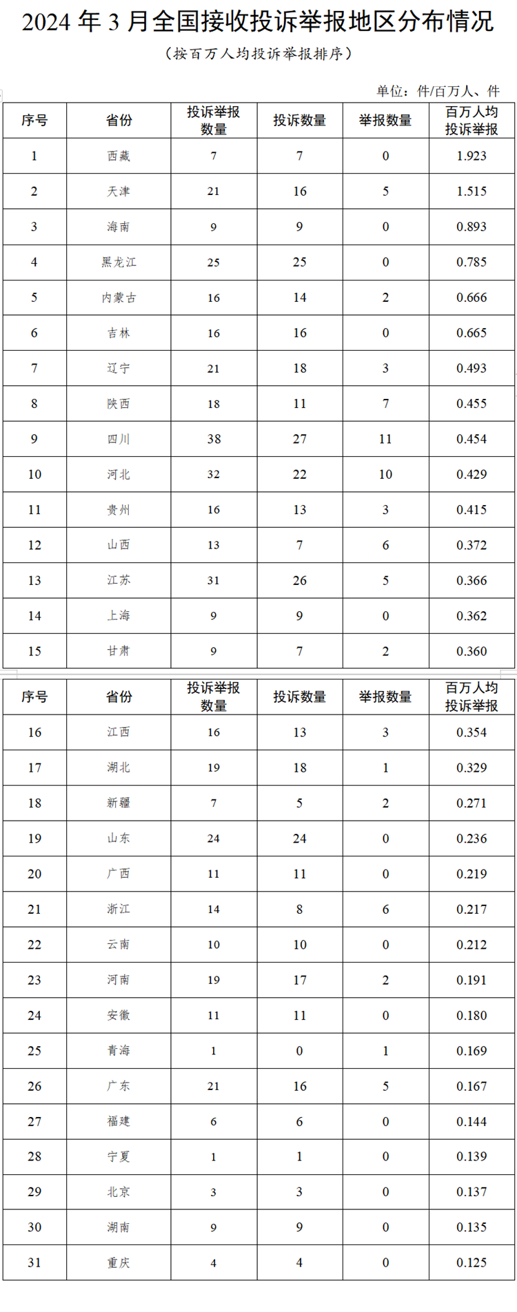 各省(自治區(qū)、直轄市)按照接收投訴舉報(bào)數(shù)量排序,四川、河北、江蘇、黑龍江、山東排在全國(guó)前5位。按百萬(wàn)人均投訴舉報(bào)數(shù)量排序,西藏、天津、海南、黑龍江、內(nèi)蒙古排在全國(guó)前5位。(2024年3月全國(guó)接收投訴舉報(bào)地區(qū)分布情況,見附件1)