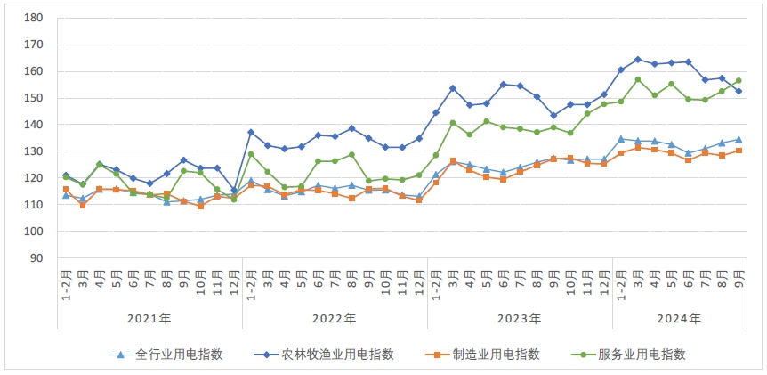 9月,農(nóng)林牧漁業(yè)用電指數(shù)為152.6,比2020年基期增長(zhǎng)了52.6%,年均增長(zhǎng)11.1%,同比增長(zhǎng)6.4%,同比增速比上月回升1.8個(gè)百分點(diǎn)。