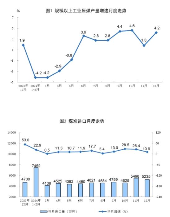 原煤生產(chǎn)增速加快。12月份,規(guī)上工業(yè)原煤產(chǎn)量4.4億噸,同比增長4.2%,增速比11月份加快2.4個百分點(diǎn);日均產(chǎn)量1415.6萬噸。進(jìn)口煤炭5235萬噸,同比增長10.9%。