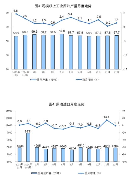 原油生產(chǎn)增速加快。12月份,規(guī)上工業(yè)原油產(chǎn)量1790萬噸,同比增長1.4%,增速比11月份加快1.2個百分點(diǎn);日均產(chǎn)量57.7萬噸。進(jìn)口原油4784萬噸,同比下降1.1%。