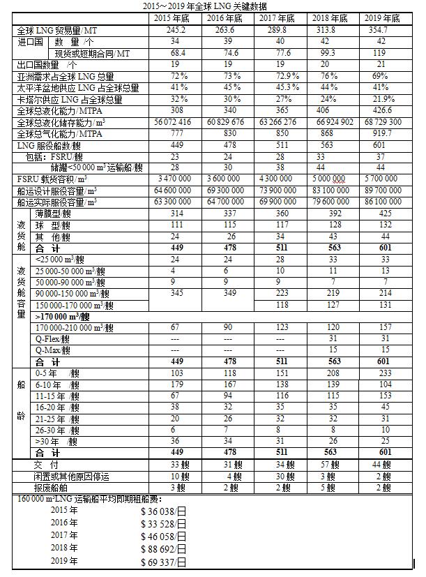 截至2019年底,有601艘運(yùn)輸船,包括37艘FSRU和44艘儲(chǔ)罐<50 000 m3運(yùn)輸船。