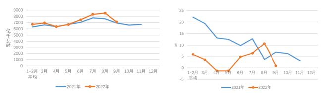 圖1 2021、2022年分月全社會(huì)用電量及其增速
