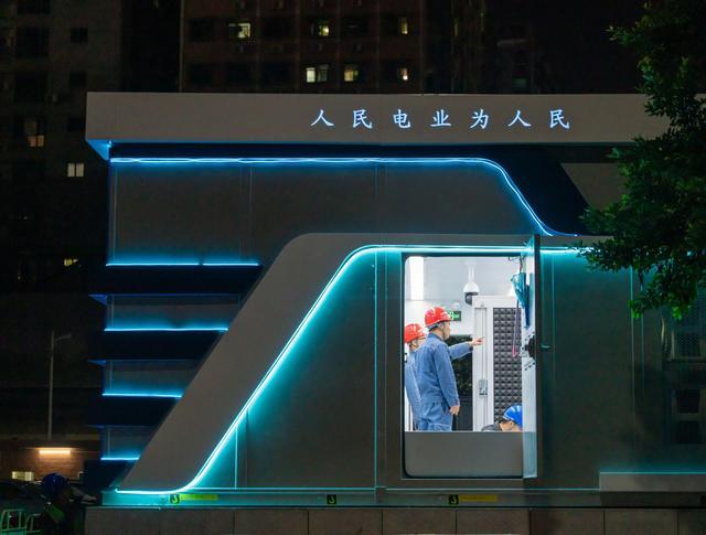 華燈初上,夜色闌珊,位于寶安區(qū)新橋街道的萬(wàn)豐村,一座外形酷似魔方的建筑格外引人注目。只見(jiàn)一個(gè)巨大的南方電網(wǎng)logo映入眼簾,散發(fā)著柔和幽靜的藍(lán)色微光。“涓涓流淌”的飄帶與logo時(shí)而匯聚、時(shí)而分散,與背后高速穿梭的地鐵11號(hào)線交相輝映。這是南方電網(wǎng)深圳供電局研發(fā)的新型全預(yù)裝近零碳景觀配電站,被稱為“電力魔方”。