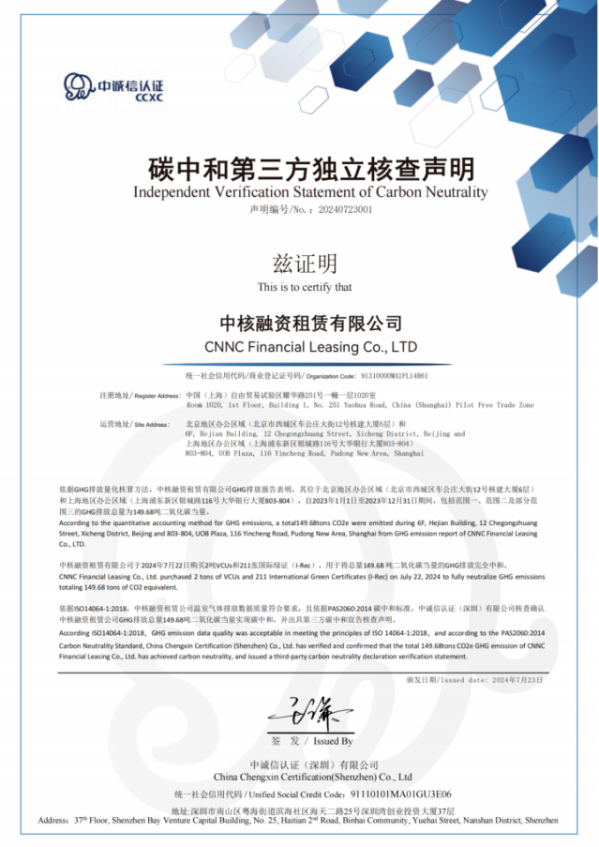 近日,中核融資租賃有限公司獲權(quán)威第三方機構(gòu)中誠信認(rèn)證頒發(fā)碳中和認(rèn)證,成為首家實現(xiàn)運營碳中和的融資租賃公司。