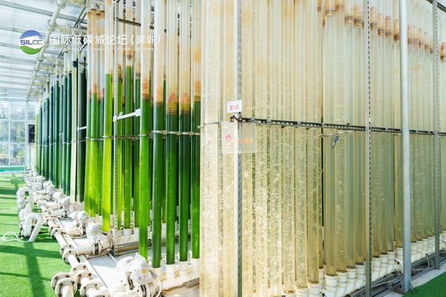 踏入微藻陽光房,仿佛步入一片“森林氧吧”,在一排排透明的立柱反應(yīng)器中,綠藻正通過光合作用,不斷“吞噬”著提純后的二氧化碳。