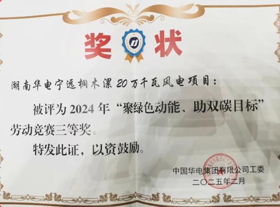 從《關于表彰2024年“聚綠色動能、助雙碳目標”打通“堵點”專項勞動競賽先進集體和個人的決定》(中國華電工委〔2025〕37號)中獲悉,公司所屬桐木漯20萬千瓦風電項目榮獲2024年集團公司“聚綠色動能、助雙碳目標”勞動競賽三等獎。新能湖南分公司工程建設部(物資部)主任賀亮平榮獲2024年集團公司“聚綠色動能、助雙碳目標”勞動競賽打通“堵點”能手榮譽稱號。