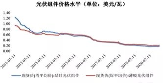從光伏發(fā)電的成本看,光伏組件和配件價格都在逐漸下降。2008年,我國光伏組件平均成本為25元,2019年這一成本降至了2元。