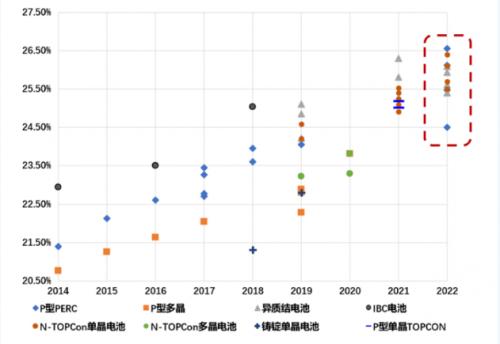 在內(nèi)外部環(huán)境的共同推動下,我國光伏企業(yè)加大工藝技術(shù)研發(fā)力度,生產(chǎn)工藝水平不斷進(jìn)步,不斷刷新紀(jì)錄。據(jù)中國光伏行業(yè)協(xié)會統(tǒng)計(jì),2014—2022年,我國企業(yè)、研究機(jī)構(gòu)晶硅電池實(shí)驗(yàn)室效率共打破世界紀(jì)錄56次;2022年,刷新效率紀(jì)錄14次,其中10次為n型電池技術(shù)。未來隨著生產(chǎn)成本的降低及良率的提升,n型電池將會成為電池技術(shù)的主要發(fā)展方向之一。
