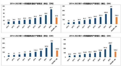 近年來,我國光伏發(fā)電裝機(jī)規(guī)模持續(xù)擴(kuò)大,目前已成為全球最大的光伏應(yīng)用市場。2014~2022年,年均復(fù)合增長率約為41.3%。2022年,我國新增光伏發(fā)電并網(wǎng)裝機(jī)容量87.41GW,連續(xù)10年穩(wěn)居世界首位。截至2022年底,我國光伏發(fā)電并網(wǎng)裝機(jī)容量達(dá)到3.9億kW,同比增長28.1%,連續(xù)8年穩(wěn)居全球首位。2023年1~4月,我國新增光伏發(fā)電并網(wǎng)裝機(jī)容量48.31GW,同比增長186%,已超過2022年前八個月總裝機(jī)容量。截至2023年4月底,我國光伏累計(jì)裝機(jī)4.4億kW,僅次于火力發(fā)電,在全國電力總裝機(jī)中的占比為16.6%。