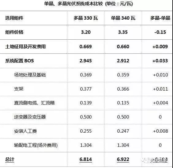 其中假設(shè)多晶組件價格為3.20元/瓦,單晶組件價格為3.35元/瓦。根據(jù)計算可知,多晶系統(tǒng)每瓦可以少花0.108元人民幣。