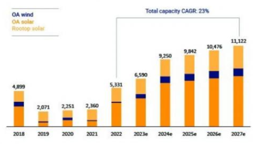 印度的基本關稅(BCD)進口稅以及型號和制造商批準名單(ALMM)計劃在繼續(xù)限制供應,因此,印度最近一直在經歷組件供應短缺問題。鑒于此,報告認為,在今年剩下的時間里,增速將會放緩,但2024年及之后的數字將開始更快的增長。預計2023年,企業(yè)可再生能源容量將增加6.5GW,而2024年將超過9GW。