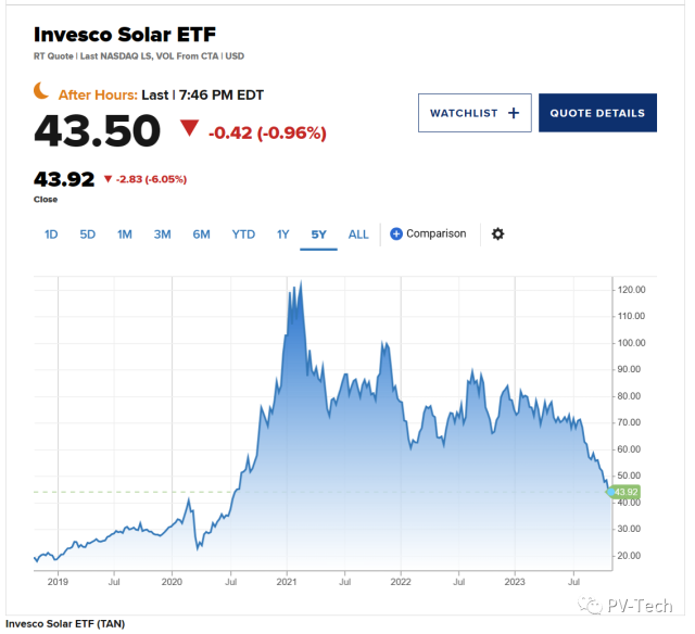上周五(10月20日),Invesco Solar ETF(TAN)暴跌6.57%,最新交易價(jià)為44.18美元,創(chuàng)下2020年7月以來的最低水平。由于前景悲觀,太陽能行業(yè)股票普遍下跌。