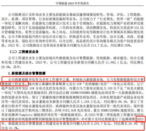 目前,中國能建正在積極搶占新能源市場,大力發(fā)展新能源和綜合智慧能源工程業(yè)務。2023年,公司新能源及綜合智慧能源工程建設業(yè)務新簽合同金額為5291.7億元,同比增長26.1%,占比達41.2%。