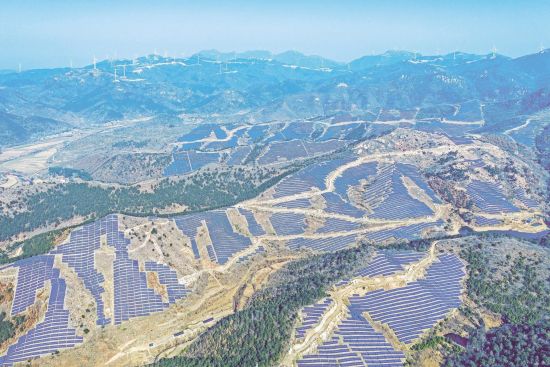 發(fā)電站背后十幾個山頭的向陽坡上,分散著占地700多畝的太陽能光伏發(fā)電場,在陽光下熠熠生輝。光伏板每塊約0.75平方米,總計有160萬塊,總裝機(jī)容量50兆瓦。在光照條件好的情況下,光伏板每天可發(fā)電近20萬千瓦時。
