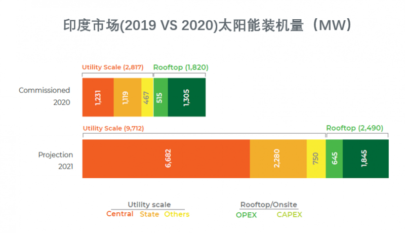 2021,印度市場(chǎng)預(yù)計(jì)將投產(chǎn)約9.7GW的新公用事業(yè)規(guī)模太陽(yáng)能項(xiàng)目和2.5GW的屋頂/現(xiàn)場(chǎng)太陽(yáng)能項(xiàng)目