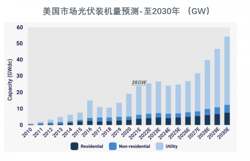 2020年,美國(guó)太陽(yáng)能新增裝機(jī)較2019年增長(zhǎng)了43%,裝機(jī)量達(dá)到了19.2GW,突破了歷史記錄