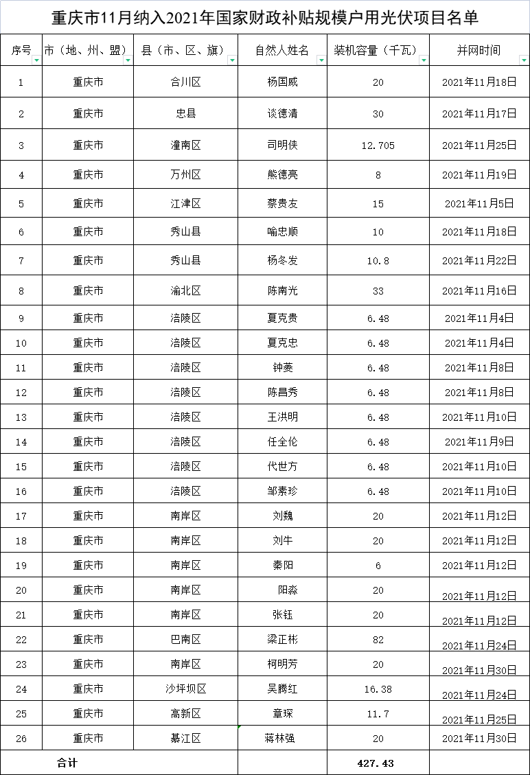 經(jīng)我公司統(tǒng)計(jì),重慶市今年11月申請納入2021年國家財(cái)政補(bǔ)貼規(guī)模的戶用光伏項(xiàng)目共有27個(gè),裝機(jī)容量為487.43千瓦。1-11月申請納入2021年國家財(cái)政補(bǔ)貼規(guī)模的戶用光伏項(xiàng)目共有140個(gè),裝機(jī)容量2584.51千瓦?,F(xiàn)按要求公示如下: