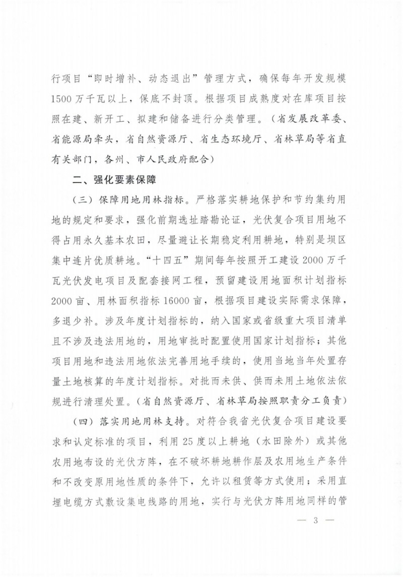 “十四五”期間按照每年開工20GW光伏項目及配套接網工程預留建設用地面積2000畝、用林面積1600畝,根據(jù)實際需求多退少補。對于涉及國家或省級重大項目的,用地審批配置國家計劃指標。對于符合光伏復合項目建設要求和認定標準的,利用25度以上耕地或其他農用地的,在不破壞耕地、不改變原用地性質的項目允許以租賃方式使用。