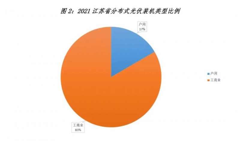 根據電網公司分布式光伏并網數據,截止到 2021 年 12 月,江蘇分布式光伏累計并網規(guī)模為 982.91 萬千瓦,其中,累計戶用光伏并網 163.37 萬千瓦,約占比17%;累計工商業(yè)分布式光伏并網 819.54 萬千瓦,約占比 83%??梢姡K分布式光伏市場以工商業(yè)分布式為絕對主導。