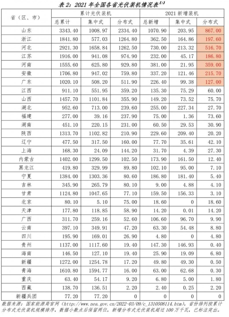 從表 2 可以看出,各省累計光伏裝機規(guī)模,江蘇排名第三,累計分布式光伏裝機規(guī)模,江蘇排名第四。2021 年新增分布式光伏裝機規(guī)模,江蘇排名第五。無論新增規(guī)模,還是累計規(guī)模,江蘇分布式光伏裝機均居于全國前列。