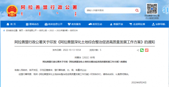 10月13日,阿拉善盟行政公署官方網(wǎng)站發(fā)布“關(guān)于印發(fā)《阿拉善盟深化土地綜合整治促進(jìn)高質(zhì)量發(fā)展工作方案》的通知”。