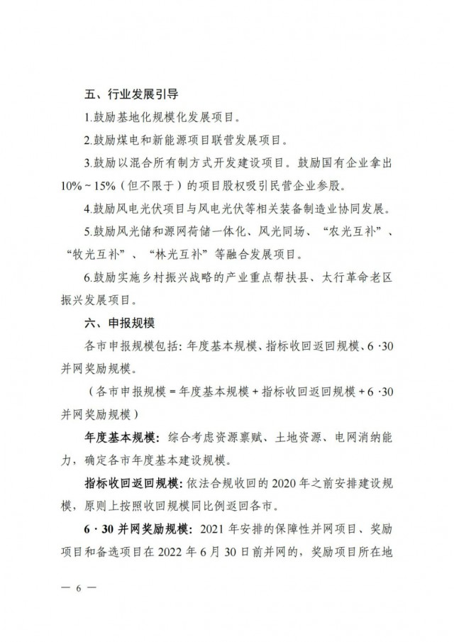 同時,《方案》提出:鼓勵基地化規(guī)模化發(fā)展項目,鼓勵煤電和新能源項目聯(lián)營發(fā)展項目,鼓勵以混合所有制方式開發(fā)建設(shè)項目,鼓勵國有企業(yè)拿出10%~ 15%(但不限于)的項目股權(quán)吸引民營企業(yè)參股,鼓勵風電光伏項目與風電光伏等相關(guān)裝備制造業(yè)協(xié)同發(fā)展,鼓勵風光儲和源網(wǎng)荷儲一體化、風光同場、“農(nóng)光互補”、“牧光互補”、“林光互補”等融合發(fā)展項目,鼓勵實施鄉(xiāng)村振興戰(zhàn)略的產(chǎn)業(yè)重點幫扶縣、太行革命老區(qū)振興發(fā)展項目。