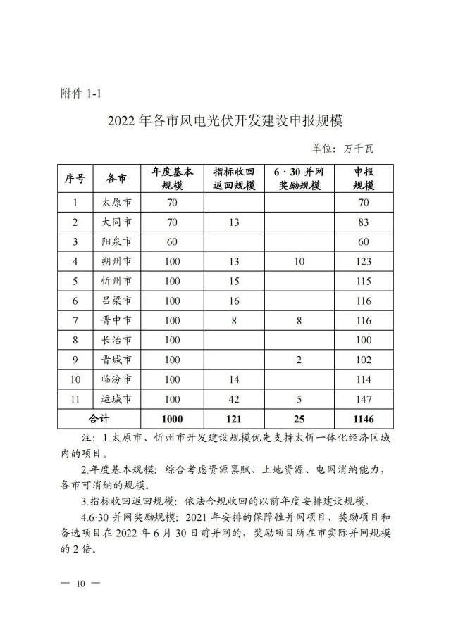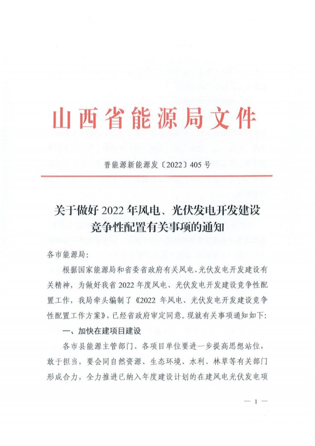 近日,索比光伏網(wǎng)獲悉,山西省能源局印發(fā)《關(guān)于做好2022年風電、光伏發(fā)電開發(fā)建設(shè)競爭性配置有關(guān)事項的通知》(晉能源新能源發(fā)〔2022〕405號),明確安排風電、光伏保障性并網(wǎng)年度規(guī)模1000萬千瓦,獎勵規(guī)模146萬千瓦。