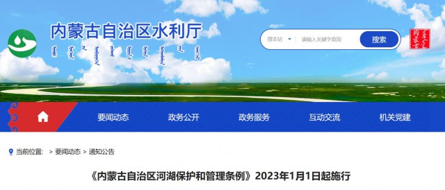 2022年11月23日,內(nèi)蒙古自治區(qū)第十三屆人民代表大會常務(wù)委員會第三十八次會議通過《內(nèi)蒙古自治區(qū)河湖保護和管理條例》,現(xiàn)予公布,自2023年1月1日起施行。