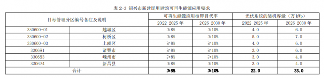 12月26日,紹興市建設局公示《紹興市綠色建筑專項規(guī)劃(2022-2030)(草案)》,其中提到,新建民用建筑(農(nóng)民自建住宅除外),應當按照國家和省有關標準利用可再生能源??稍偕茉蠢迷O施應當與建筑主體一體化設計,同步施工、同步驗收。新建民用建筑應采用可再生能源系統(tǒng),應配置太陽能系統(tǒng),滿足浙江省工程建設標準《民用建筑可再生能源應用核算標準》的要求。 至2025 年,紹興市各縣(市、區(qū))新建民用建筑可再生能源應用核算替代率達到 8%,太陽能光伏系統(tǒng)的裝機容量達到 22.0 萬 kWp。至 2030 年,紹興市各縣(市、區(qū))新建民用建筑可再生能源應用核算替代率達到 10%,太陽能光伏系統(tǒng)的裝機容量達到 33.0 萬 kWp。