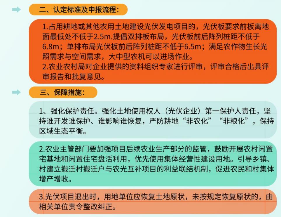 4、采用“農(nóng)光互補”模式使用永久基本農(nóng)田以外的耕地建設(shè)光伏復合項目的,需縣級農(nóng)業(yè)農(nóng)村部門出具不影響農(nóng)業(yè)生產(chǎn)的意見后實施。項目開工前,企業(yè)需與所在縣、村委、農(nóng)戶簽訂三方補償協(xié)議,報縣級自然資源和農(nóng)業(yè)農(nóng)村部門備案。