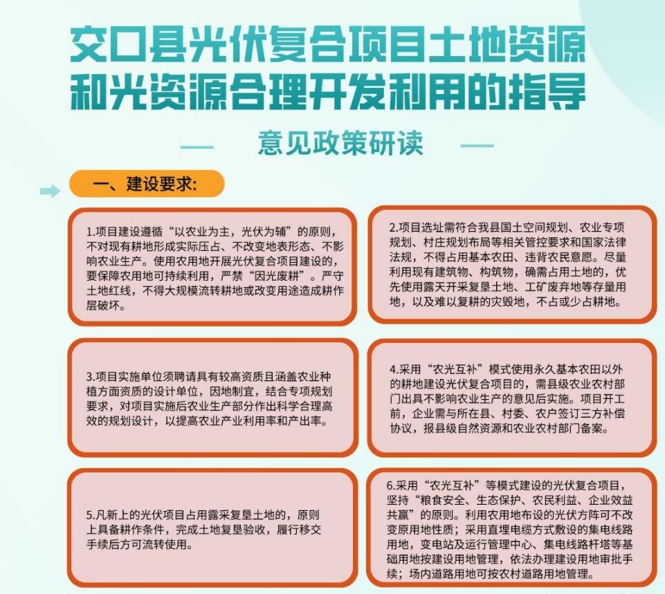1月28日,山西省呂梁市交口縣人民政府印發(fā)《交口縣光伏復合項目土地資源和光資源合理開發(fā)利用的指導性意見》,意見要求:項目建設(shè)遵循“以農(nóng)業(yè)為主,光伏為輔”的原則,不對現(xiàn)有耕地形成實際壓占、不改變地表形態(tài)、不影響農(nóng)業(yè)生產(chǎn)。使用農(nóng)用地開展光伏復合項目建設(shè)的,要保障農(nóng)用地可持續(xù)利用,嚴禁“因光廢耕”。嚴守土地紅線,不得大規(guī)模流轉(zhuǎn)耕地或改變用途造成耕作層破壞。項目選址需符合我縣國土空間規(guī)劃、農(nóng)業(yè)專項規(guī)劃、村莊規(guī)劃布局等相關(guān)管控要求和國家法律法規(guī),不得占用基本農(nóng)田、違背農(nóng)民意愿。盡量利用現(xiàn)有建筑物、構(gòu)筑物,確需占用土地的,優(yōu)先使用露天開采復墾土地、工礦廢棄地等存量用地,以及難以復耕的災毀地,不占或少占耕地。