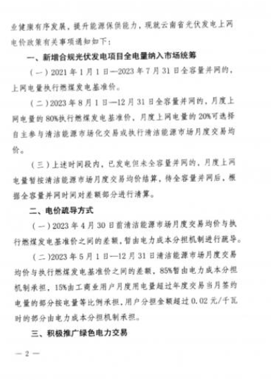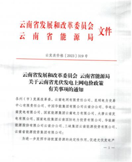4月3日,云南省發(fā)展和改革委員會、云南省能源局發(fā)布了《關(guān)于云南省光伏發(fā)電上網(wǎng)電價政策有關(guān)事項的通知》。該政策自2023年4月1日起執(zhí)行。通知顯示,為進(jìn)一步發(fā)揮市場配置資源的決定性作用,促進(jìn)光伏發(fā)電產(chǎn)業(yè)健康有序發(fā)展,提升能源保供能力,云南省對新增合規(guī)光伏發(fā)電項目全電量納入市場統(tǒng)籌。