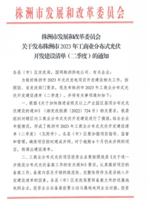 株洲市發(fā)改委要求,工商業(yè)分布式光伏項(xiàng)目投資企業(yè)要按照《關(guān)于進(jìn)一步規(guī)范分布式光伏備案工作的有關(guān)通知》要求,認(rèn)真做好項(xiàng)目的備案工作,備案內(nèi)容及手續(xù)的規(guī)范性、完整性將作為是否納入開發(fā)建設(shè)清單的因素。各縣(市)區(qū)發(fā)改局要將備案文件抄送屬地電網(wǎng)企業(yè),投資企業(yè)在備案前要主動(dòng)與屬地電網(wǎng)企業(yè)對(duì)接。