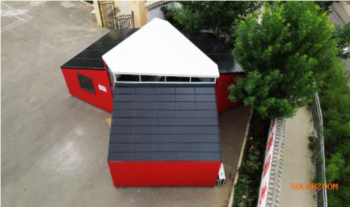 值得一提的是,此次“方寸空間微型幼兒園”為適應(yīng)溫帶半干旱氣候地區(qū)環(huán)境,設(shè)計(jì)聚落型房屋,三個(gè)單坡頂圍合中庭,外圍空間布局幼兒教學(xué)及活動(dòng)空間,中間高聳采光空間成為舞臺(tái),三個(gè)房屋之間設(shè)計(jì)通高玻璃隔斷,其中南面成為主入口,而另外兩個(gè)方向作為通風(fēng)口,中庭不僅作為幼兒很好的展示游樂場所,也可減少白天刺眼陽光與熱量。房屋四面減少窗戶以增強(qiáng)保溫隔熱,中庭設(shè)計(jì)高窗及垂直條形開口,作為主要采光通風(fēng),天氣好時(shí)可將門打開,提供良好通風(fēng)。“方寸空間微型幼兒園”做到了在陽光明媚的日子里,光伏瓦屋面提供室內(nèi)外所有的電力需求,用不完的電能自動(dòng)進(jìn)入儲(chǔ)能電池供應(yīng)陰雨天和夜間照明及電器用電。“方寸空間微型幼兒園”屋面采用可完全替代傳統(tǒng)瓦片的光伏瓦片,既解決以前光伏板左右搭接處滲漏隱患,又保證光伏瓦片搭接處平整,為學(xué)生們提供更好的學(xué)習(xí)環(huán)境。學(xué)校還可以把用不完的電賣給國家電網(wǎng),收入可用于進(jìn)一步改善學(xué)校的環(huán)境。