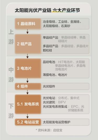 目前,我國(guó)太陽(yáng)能光伏產(chǎn)業(yè)已經(jīng)形成比較完整的產(chǎn)業(yè)鏈結(jié)構(gòu),主要分為晶體硅與薄膜電池兩大類,產(chǎn)業(yè)鏈劃分為晶硅原料、硅產(chǎn)品、電池片、組件、發(fā)電系統(tǒng)、電站運(yùn)營(yíng)等6個(gè)環(huán)節(jié)。上游為晶硅原料、硅產(chǎn)品環(huán)節(jié);中游為電池片、組件環(huán)節(jié);下游為應(yīng)用系統(tǒng)等環(huán)節(jié)。
