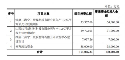 項目的實施主體為綠康(海寧)膠膜材料有限公司,實施地點為浙江省海寧市黃灣鎮(zhèn)海市路35號。項目總投資為75,367.06萬元,擬使用募集資金投入54,000.00萬元。本項目建設期為12個月,項目建設完成后將新增16,000萬平方米POE光伏膠膜、12,000萬平方米EVA光伏膠膜和4,000萬平方米EPE光伏膠膜產(chǎn)能,有助于公司進一步提高光伏膠膜的生產(chǎn)能力和市場占有率,加快業(yè)務轉(zhuǎn)型步伐,提升公司市場競爭力。