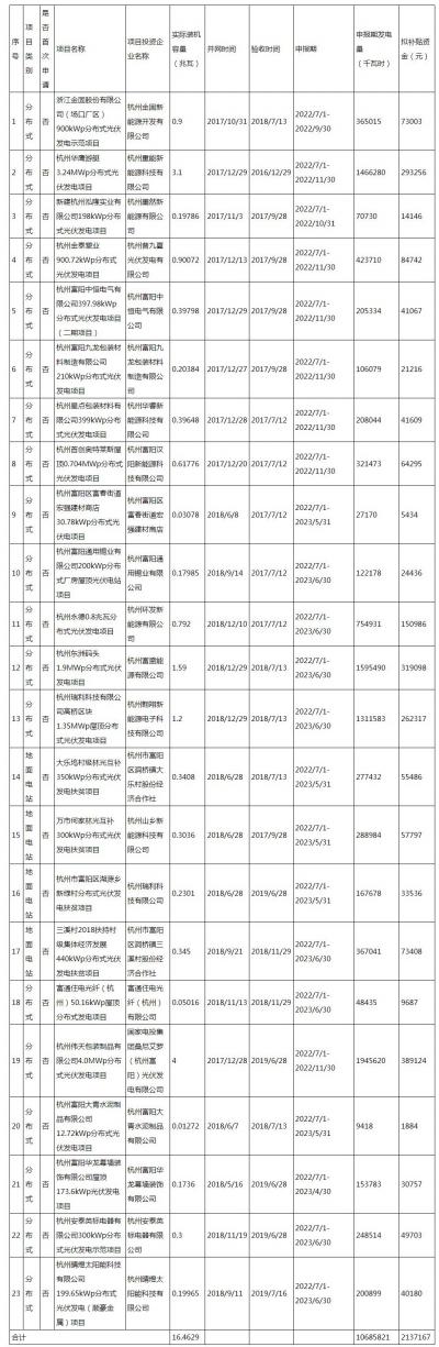 2023年富陽區(qū)非居民光伏發(fā)電項目申請區(qū)級財政補貼情況匯總表