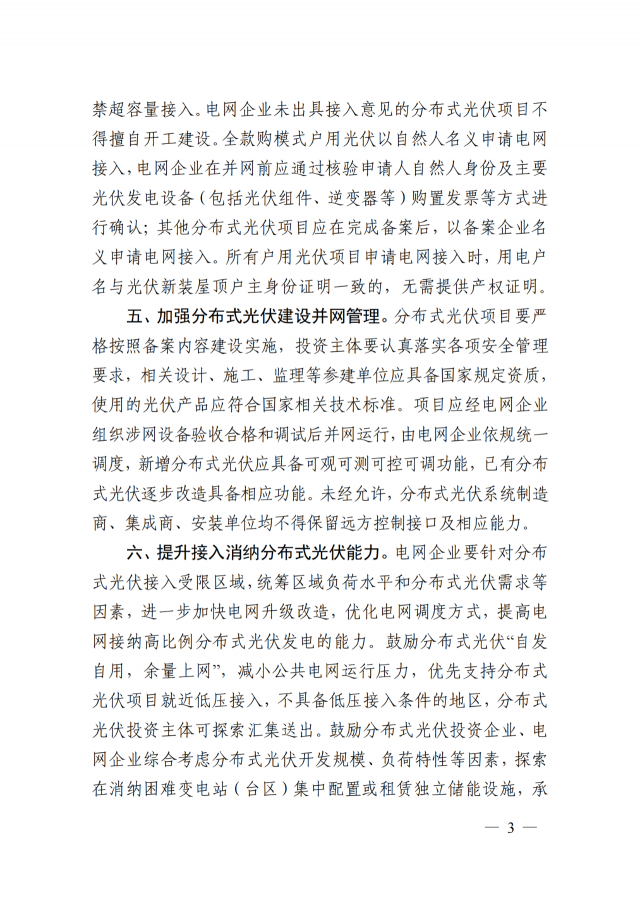 項(xiàng)目應(yīng)經(jīng)電網(wǎng)企業(yè)組織涉網(wǎng)設(shè)備驗(yàn)收合格和調(diào)試后并網(wǎng)運(yùn)行,由電網(wǎng)企業(yè)依規(guī)統(tǒng)一調(diào)度,新增分布式光伏應(yīng)具備可觀可測(cè)可控可調(diào)功能,已有分布式光伏逐步改造具備相應(yīng)功能。