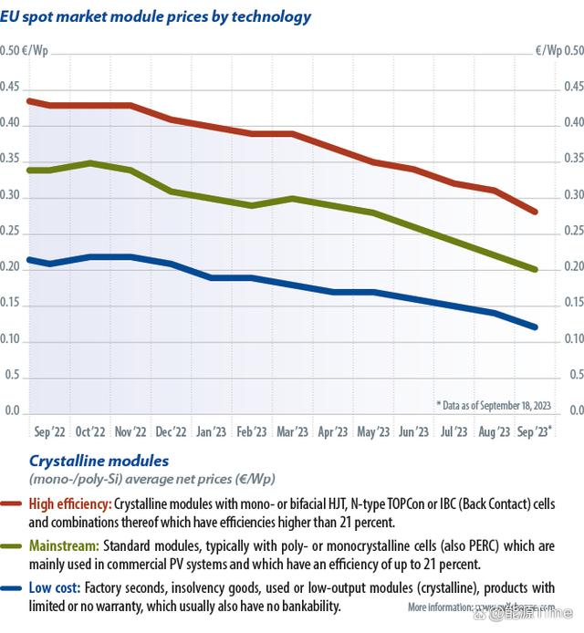 值得注意的是,歐洲的光伏組件高庫(kù)存導(dǎo)致的降價(jià)也有大量PERC組件面臨淘汰的問題。根據(jù)《PV Magazine》的說(shuō)法,目前的庫(kù)存中有大量比例的PERC組件。在N型技術(shù)越來(lái)越普及、價(jià)格越來(lái)越低的情況下,PERC組件的銷售也遭遇了很大的困難。因此降低價(jià)格是一種意料之內(nèi)的清庫(kù)存方式。