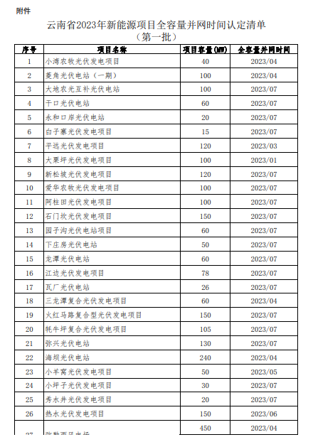 根據(jù)《云南省發(fā)展和改革委員會 云南省能源局關(guān)于云南省光伏發(fā)電上網(wǎng)電價政策有關(guān)事項的通知》(云發(fā)改價格〔2023〕319號)以及《云南省發(fā)展和改革委員會 云南省能源局關(guān)于進一步完善風電上網(wǎng)電價政策有關(guān)事項的通知》(云發(fā)改價格〔2023〕665號)文件精神,新能源全容量并網(wǎng)時間的認定由省能源局會同云南電網(wǎng)公司負責。為加強社會監(jiān)督,廣泛征求意見,現(xiàn)將經(jīng)認定后的項目清單予以公示,有關(guān)情況如下: