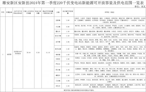根據(jù)《雄安新區(qū)安新縣2024年第一季度220千伏變電站新能源可開放容量及供電范圍一覽表》,安新縣13個(gè)鄉(xiāng)鎮(zhèn)2024年第一季度可開放容量為31.18兆瓦。
